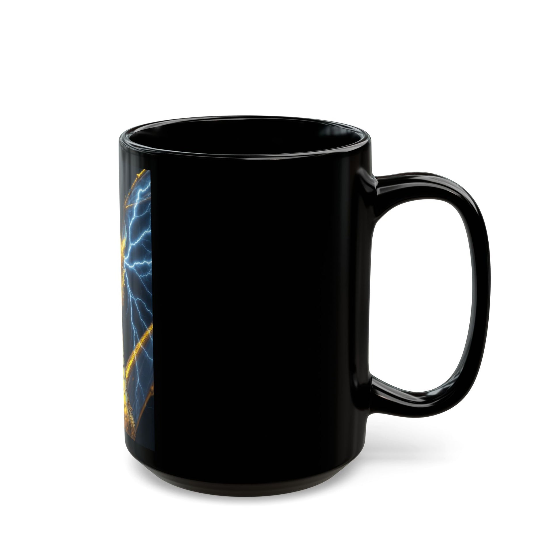 A striking black ceramic mug that brings high-fantasy energy to your morning ritual. A golden dragon, scales glinting like forged coin and eyes focused with fierce intelligence, rises against a backdrop of crackling blue lightning. The glossy black surface deepens the contrast, making the vibrant print leap from the mug and hold its color over time. It feels like holding a tiny talisman — steady and weighty in your hand, ready to kickstart writing, gaming sessions, or quiet reading by lamplight. Built for everyday use, this mug handles hot pours and dishwasher cycles without losing its shine, so the image stays bold even after many cups.