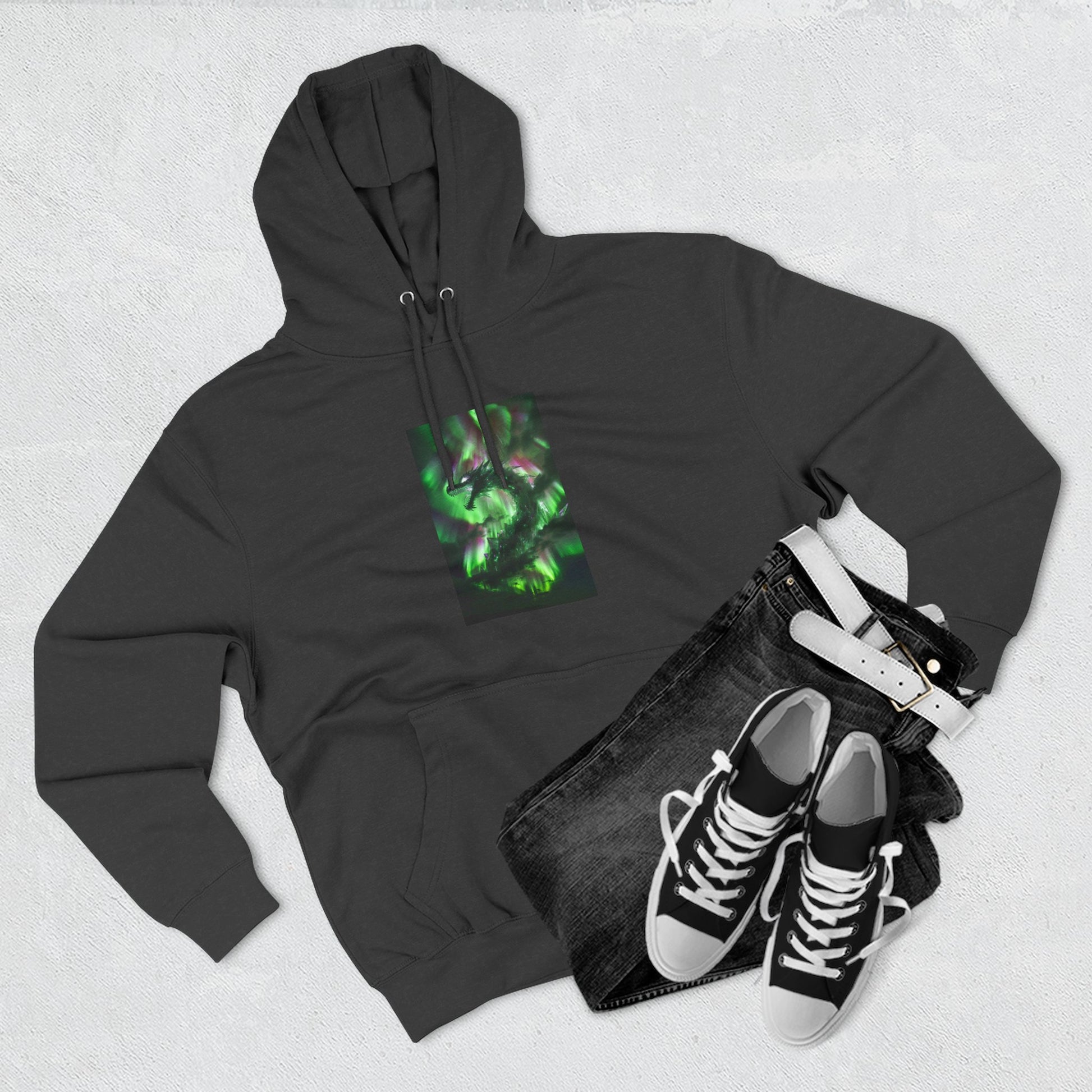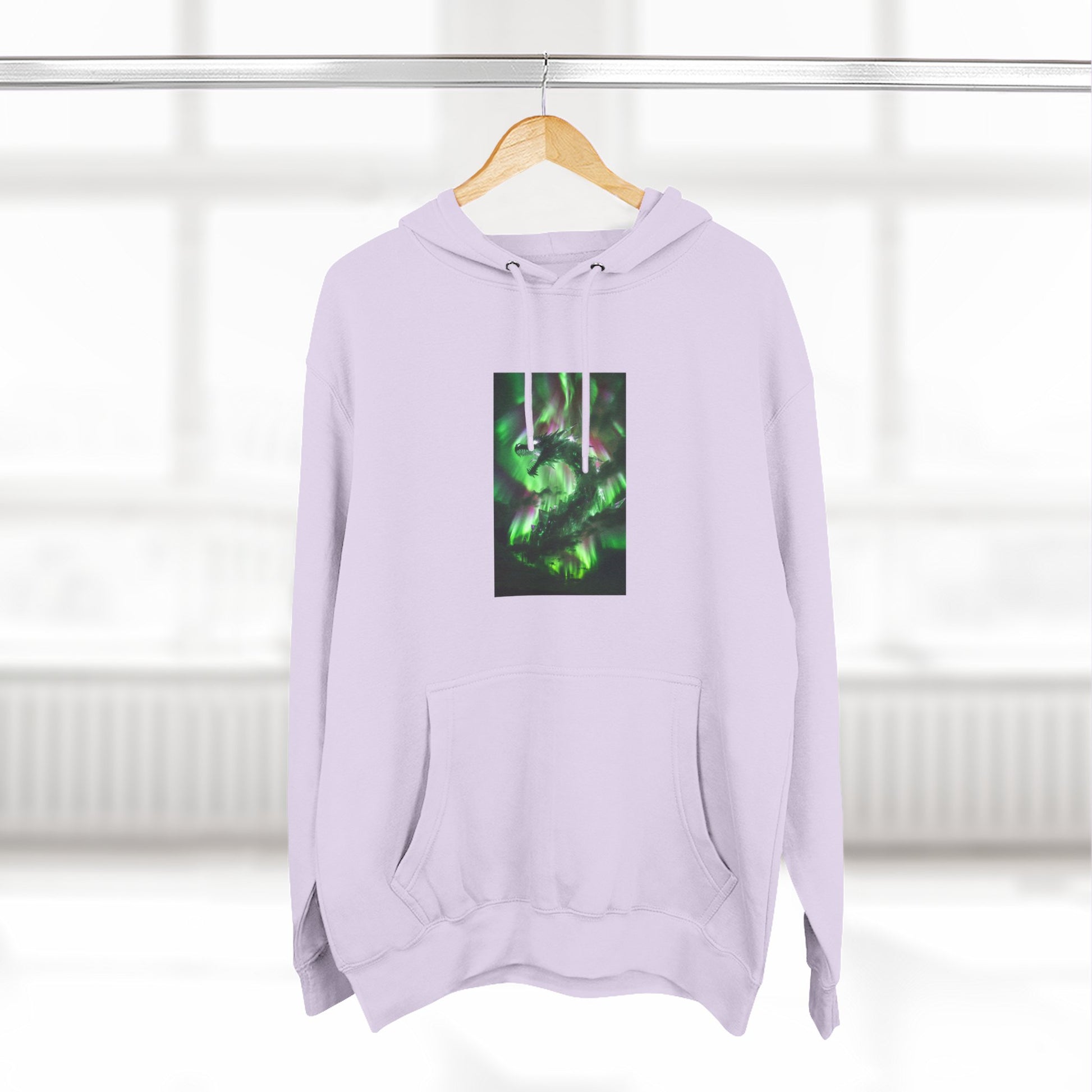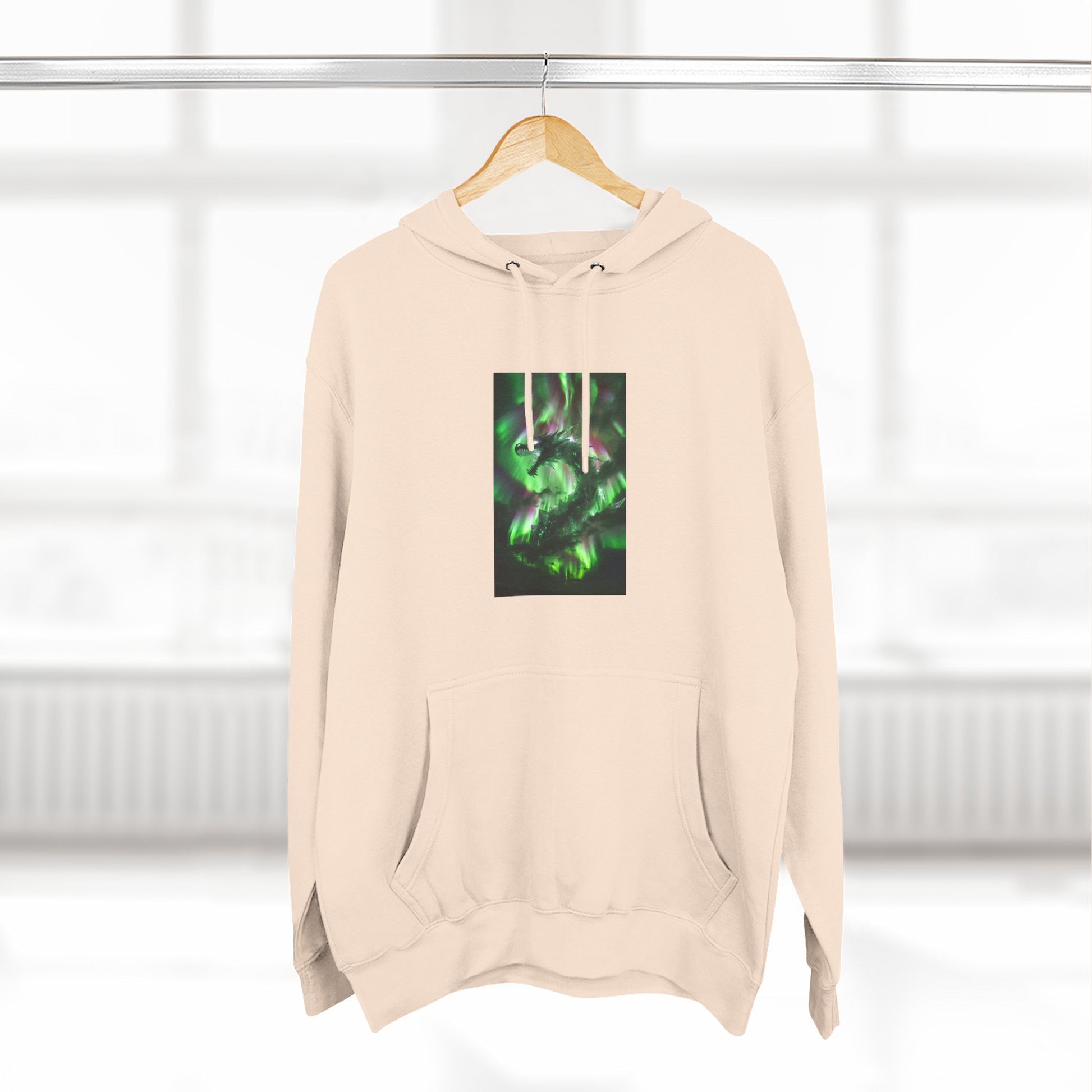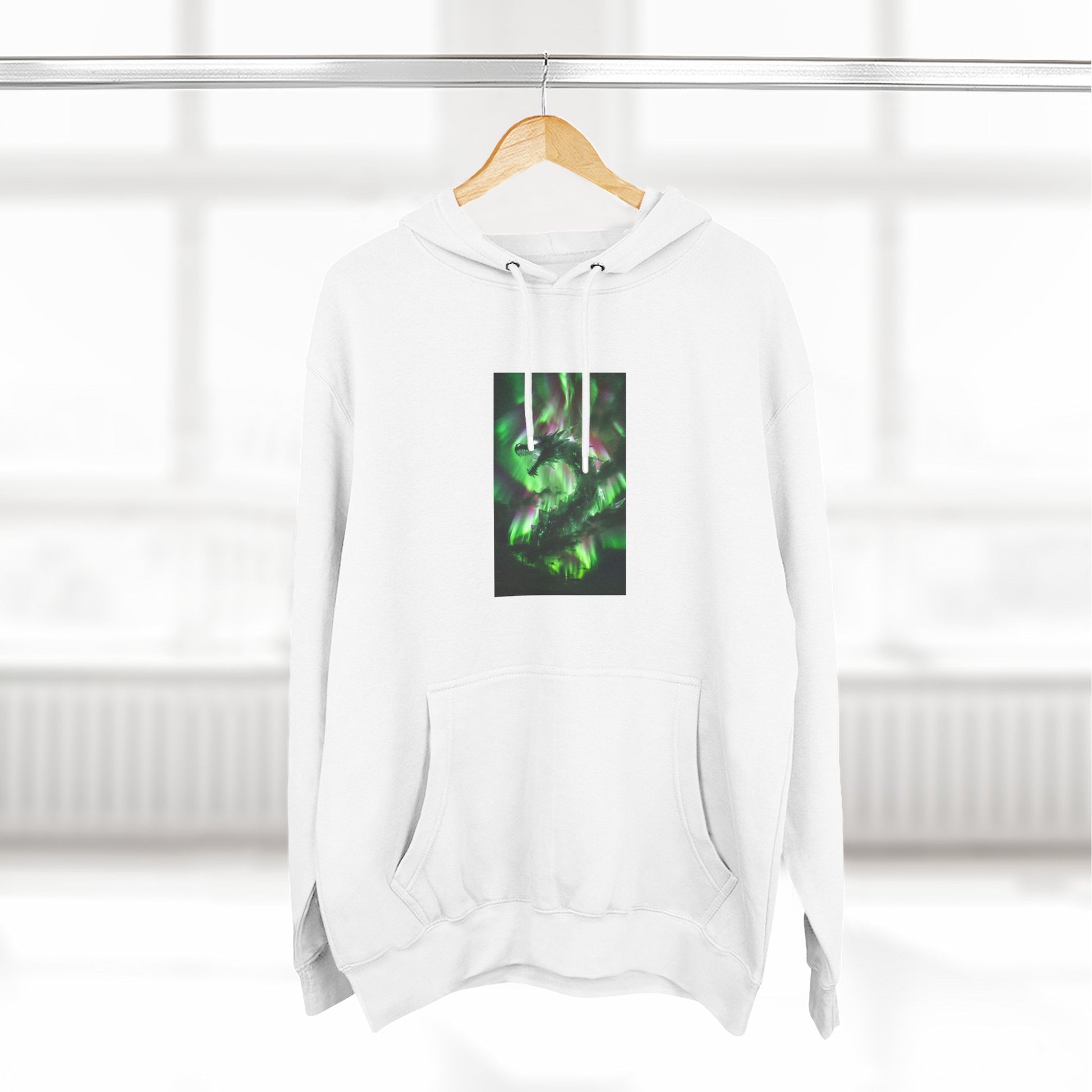 This medium-weight fleece hoodie brings an understated edge to everyday wear. The soft 3-end fleece and combed ring‑spun cotton blend feel plush against skin while holding shape through regular wear. A centered, three-panel graphic in deep greens gives the front a quietly mysterious focal point — it reads like moss-lit forest shadows or bioluminescent currents, adding personality without shouting. The roomy kangaroo pocket and adjustable hood with woven drawcords make it easy to layer on cool mornings or wear while wandering city streets late into the evening. Built with reinforced seams, twill neck tape, and minimal shrinkage, it’s designed to keep its fit and texture wash after wash.