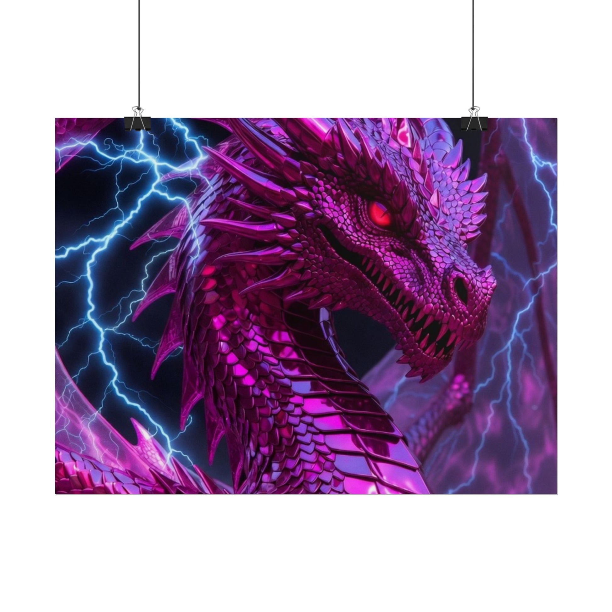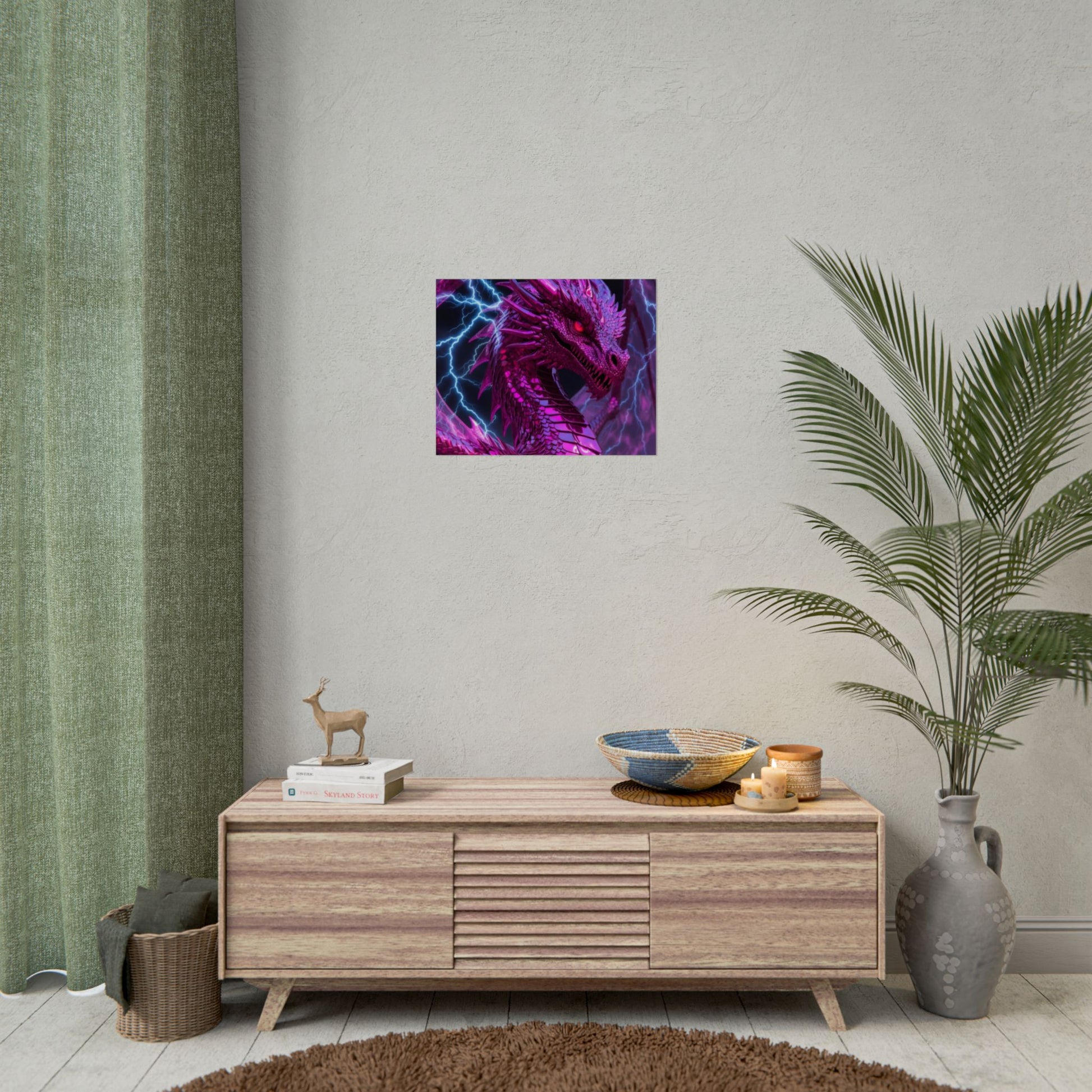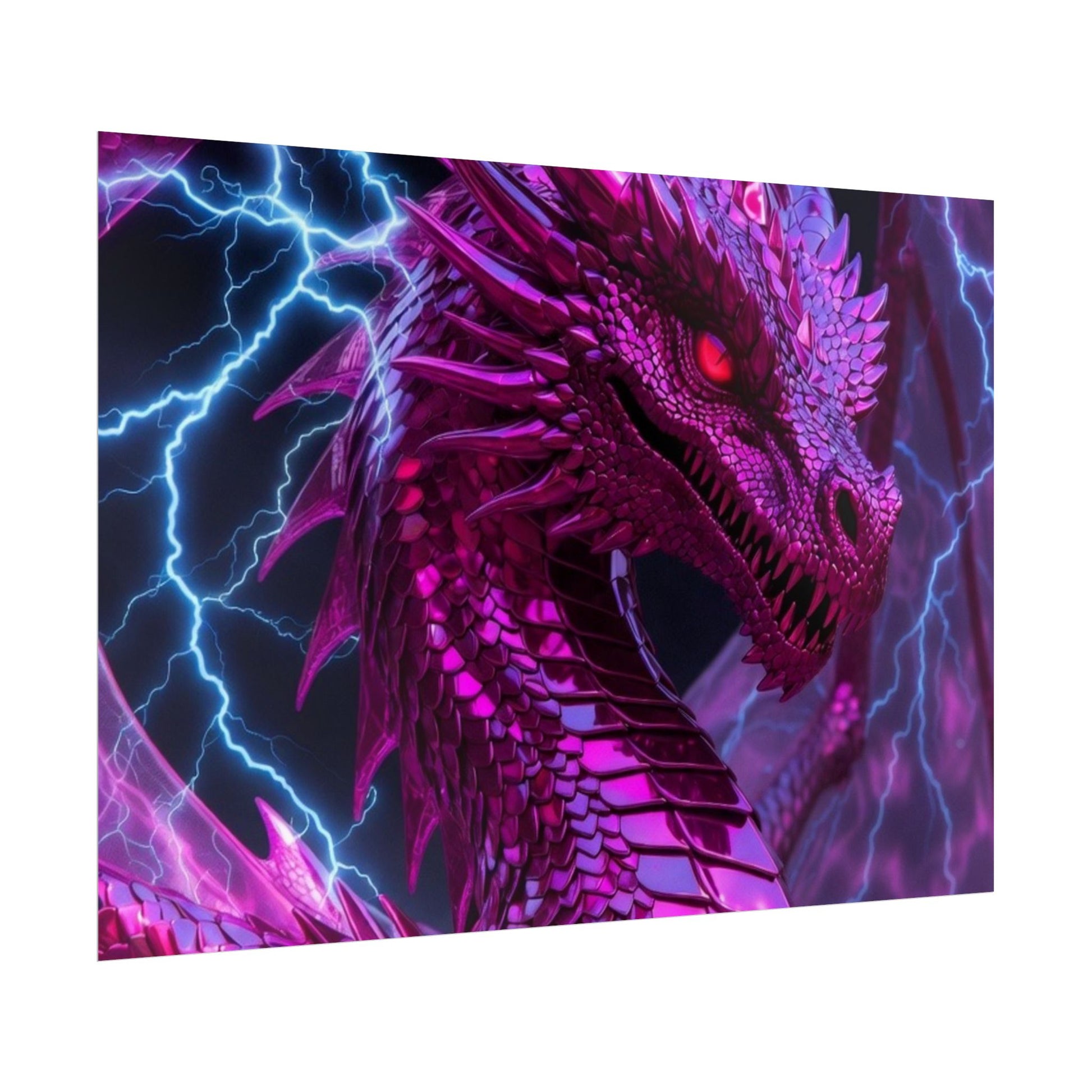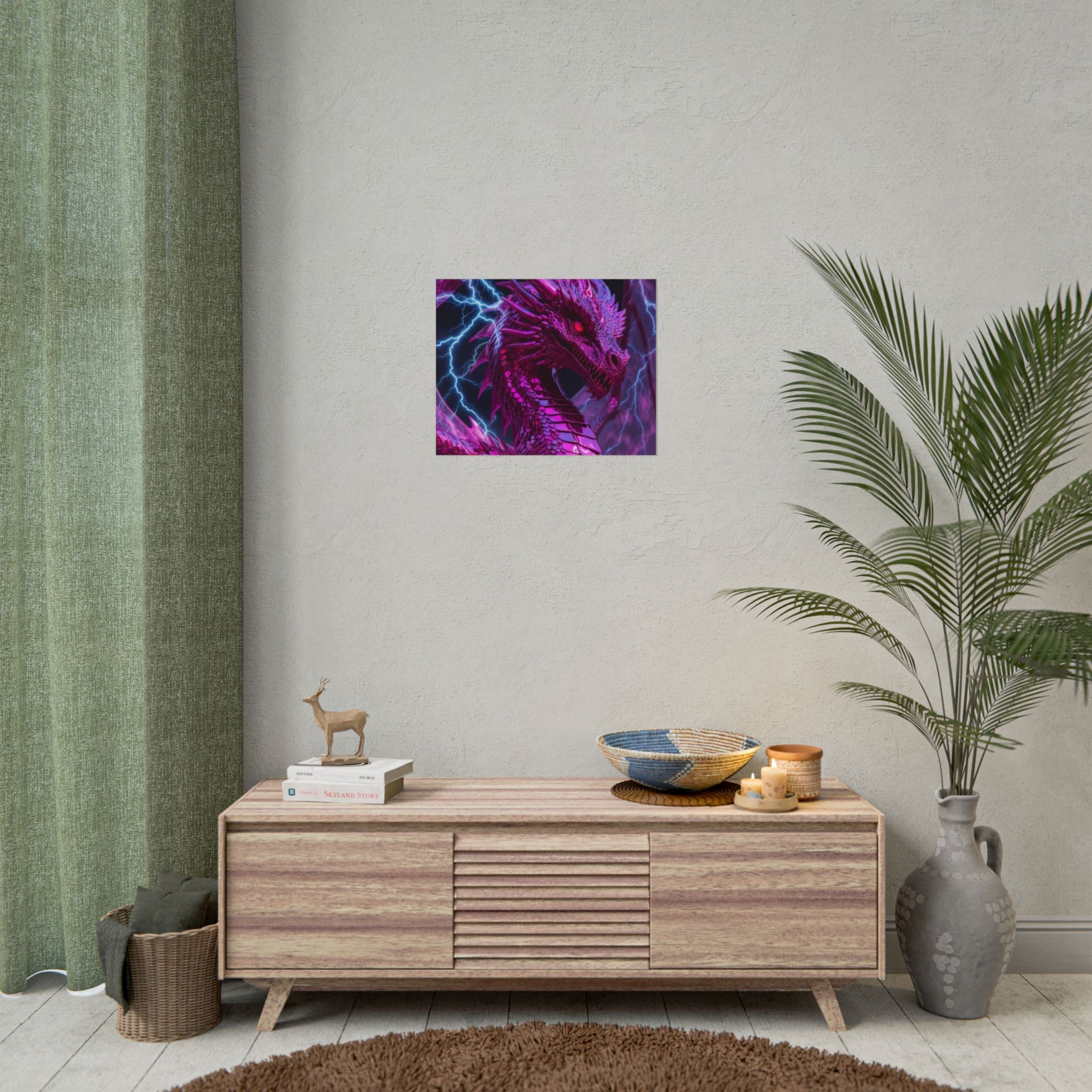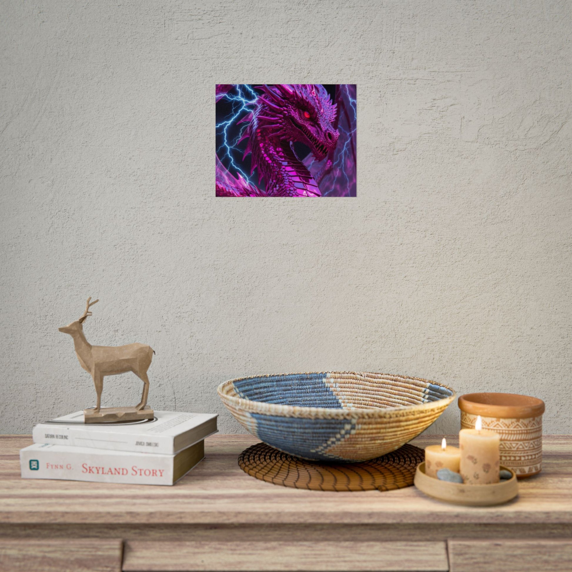This rolled poster brings a surge of neon fantasy to any wall. A fierce magenta dragon coils through electric storm clouds, scales catching light in jewel-bright giclée color. Choose fine art, semi-glossy, or matte paper to match the vibe you want — textured archival paper for a painterly look, satin-finish photo paper for punchy shine, or a low-sheen matte for a subdued, museum-feel. Multiple sizes and landscape or portrait layouts let you place it above a desk, inside a gallery wall, or tucked into a dedicated display rail. It arrives rolled for easy shipping and mounting; hang it, frame it, or swap prints with fellow collectors to keep your space alive and unpredictable.